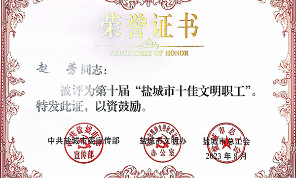 港城公司趙芳獲“鹽城市十佳文明職工”和 “五一勞動(dòng)獎(jiǎng)?wù)隆狈Q號
