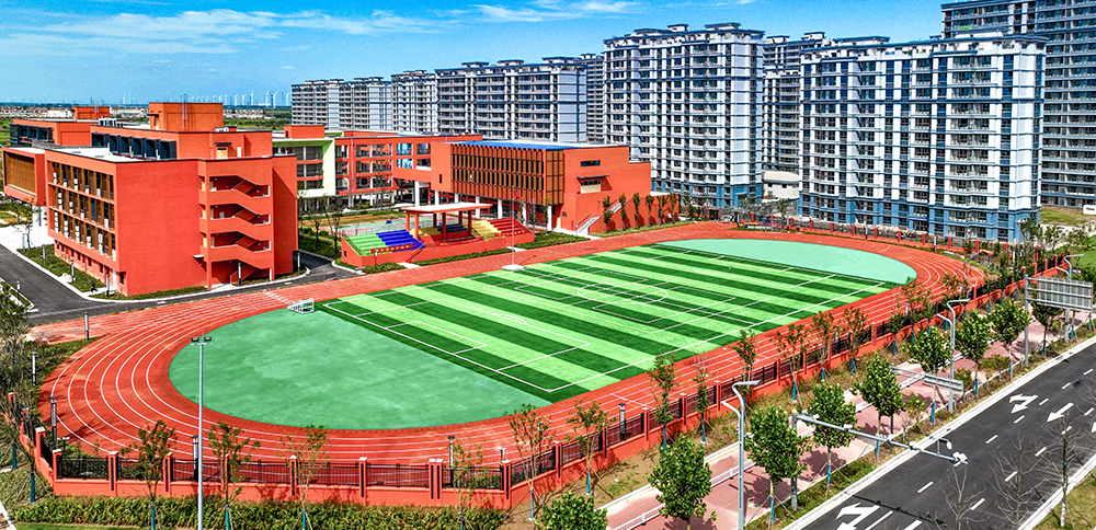 位于港城安置區(qū)一期B區(qū)南側(cè),占地面積46.5畝,建筑面積約2.2萬平方米,總投資約1.5億元。建設規(guī)模滿足36個班級1620人的辦學需求。項目總體布局采用院落式布局,包含教學樓、綜合樓、風雨操場、門衛(wèi)、看臺五個單位工程。校園建筑整體為哈弗紅現(xiàn)代風格、局部點綴彩色形體,增添活躍元素。